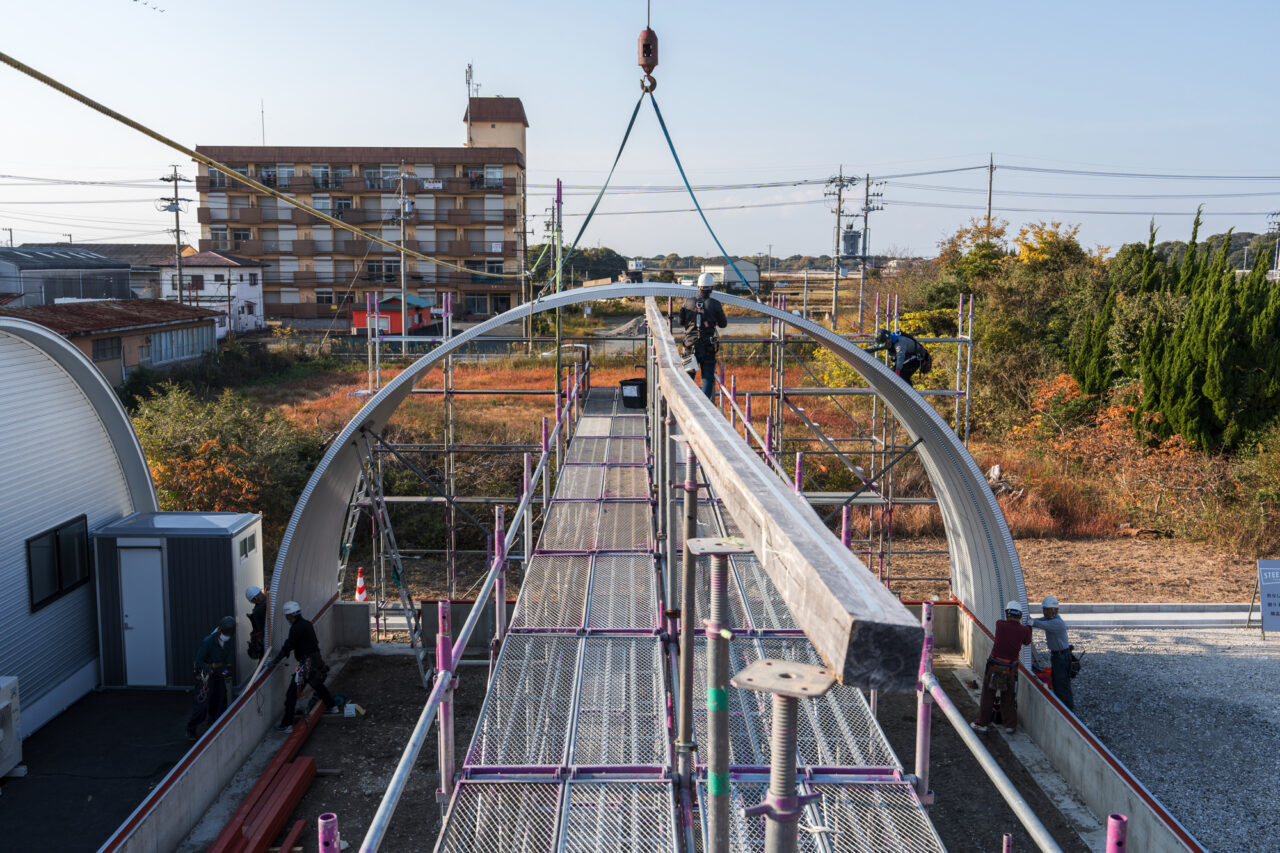 スチールアーチは、事前成型された部材を現地で組み上げる構造のため、現場作業の効率が高く、天候リスクを受けにくい点も事業用建築に適しています。
