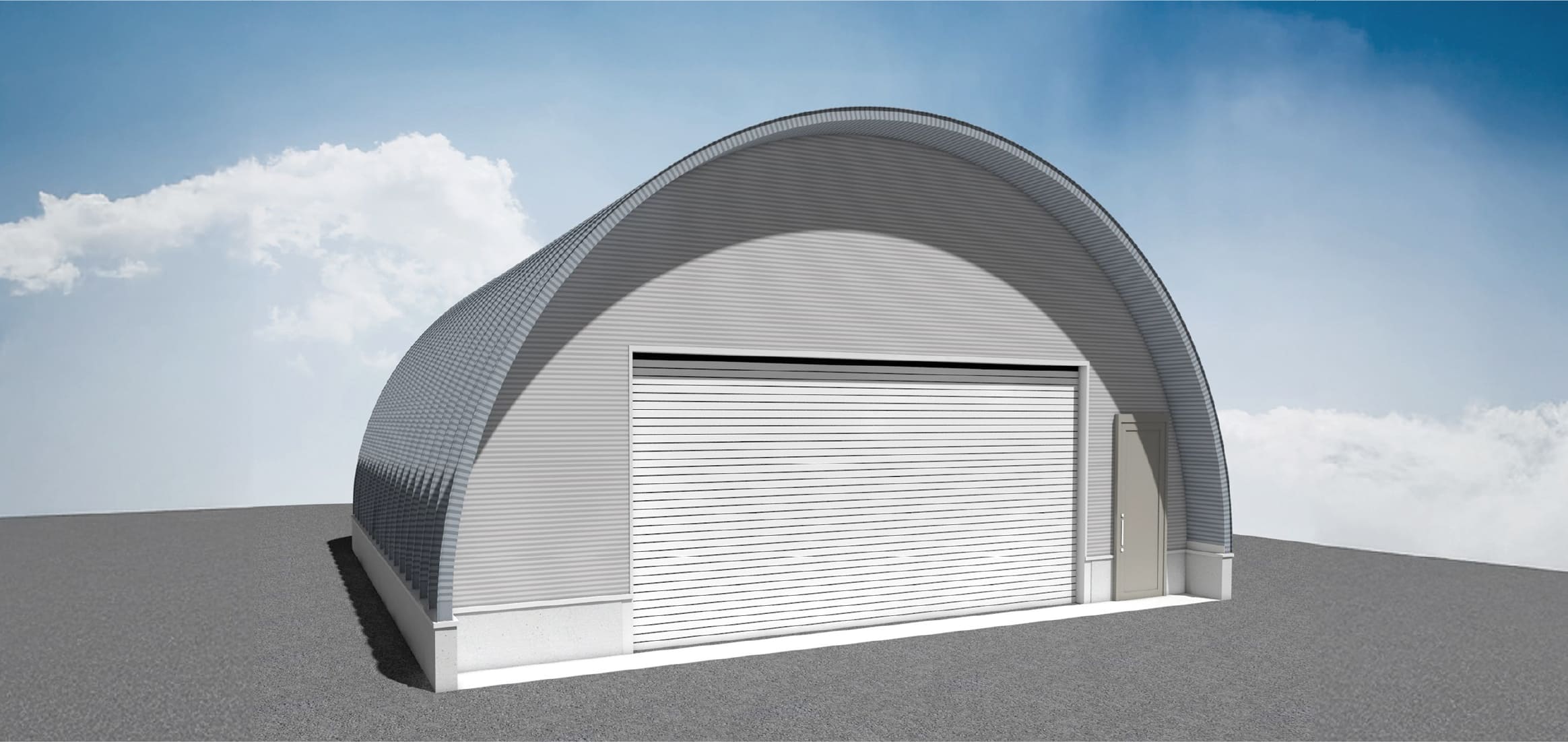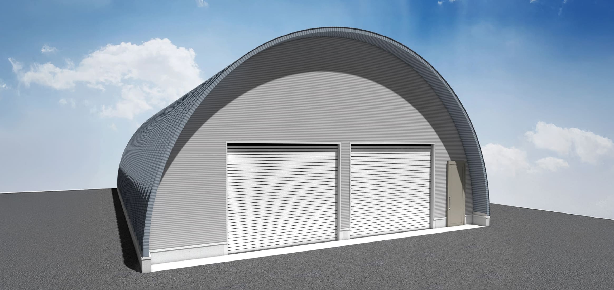 参考価格には「スチールアーチ本体」「基礎工事」「土間コンクリート工事」「シャッター(幅指定)」「勝手口」が含まれます(建築確認申請費用も含む)。電気工事、地盤改良工事、断熱工事、内装工事、付帯工事費、諸経費などは含まれておりません。正式なお見積もり時に個別にご案内いたします。